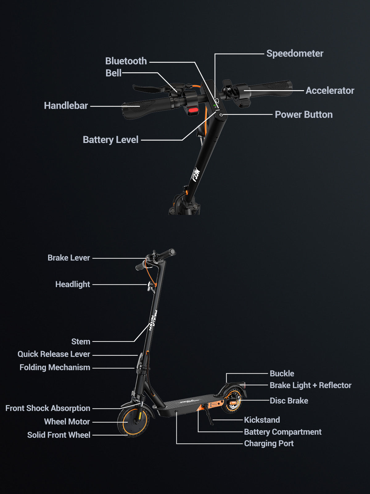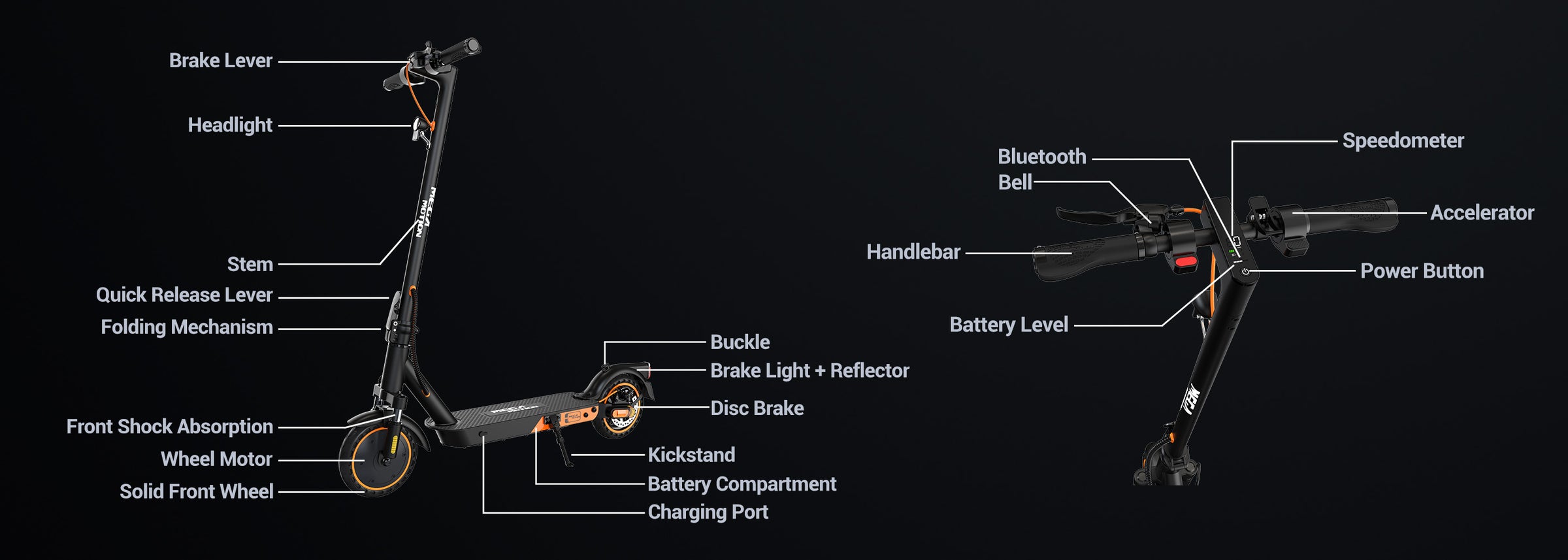 - LCD Display: Shows speed, battery level, Bluetooth connection status